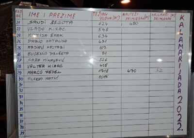 | Red. Br. | Ime i prezime | Težina ulova u gr. | Najteži primjerak | Najlakši primjerak | |